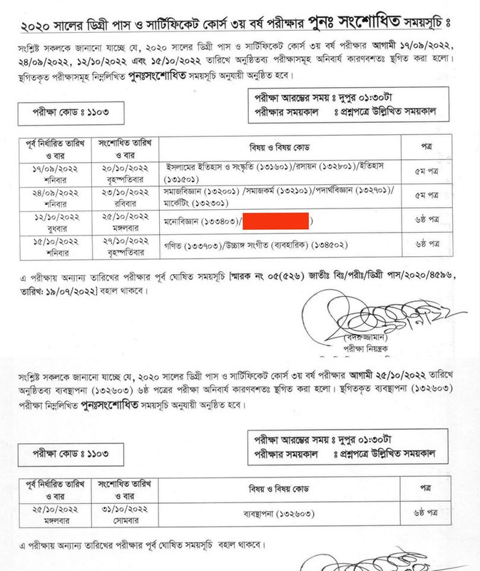 ২০২০ সালের ডিগ্রী পাস ও সার্টিফিকেট কোর্স ৩য় বর্ষ পরীক্ষার সময়সূচী পরিবর্তন। ডিগ্রী ৩য় বর্ষ পরীক্ষার সংশোধিত সময়সূচি প্রকাশ ২০২২। পরীক্ষাসমূহ শুরু হবে ০৬/০৯/২০২২ তারিখ থেকে। পরীক্ষাসমূহ প্রতিদিন দুপুর ১ঃ৩০ থেকে শুরু হবে।