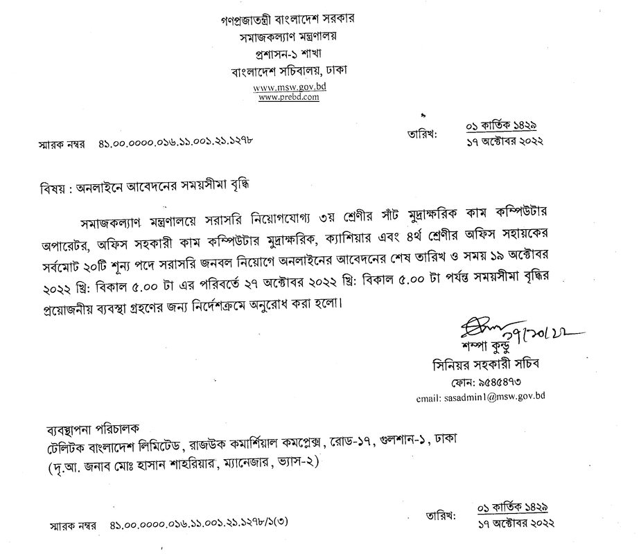 সমাজকল্যাণ মন্ত্রণালয় নিয়োগ বিজ্ঞপ্তি আবেদনের সময়সীমা বৃদ্ধি সংক্রান্ত বিজ্ঞপ্তি