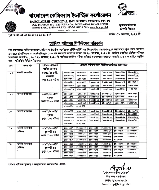 বাংলাদেশ কেমিক্যাল ইন্ডাস্ট্রিজ কর্পোরেশন (bcic) এর বিভিন্ন পদের মৌখিক পরীক্ষার পরিবর্তিত সিডিউলের বিজ্ঞপ্তি। পরীক্ষার তারিখঃ ১-৩ নভেম্বর ২০২২। বিভিন্ন ক্যাডারে ৯ম গ্রেডে ১২৩ জন কর্মকর্তা নিয়োগের মৌখিক পরীক্ষার পরিবর্তিত সিডিউলের বিজ্ঞপ্তি।