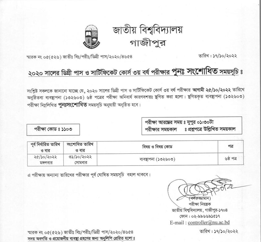 ডিগ্রি ৩য় বর্ষের (২০১৭-১৮) ২৫ অক্টোবরের স্থগিতকৃত ব্যবস্থাপনা ৬ষ্ঠ পত্রের পরীক্ষা হবে আগামী ৩১/১০/২০২২ তারিখ দুপুর ১ঃ৩০ থেকে। অন্যান্য পরীক্ষাসমূহ পূর্বঘোষিত সময়সূচি অনুযায়ী অনুষ্ঠিত হবে। ২০২০ সালের ডিগ্রী পাস ও সার্টিফিকেট কোর্স ৩য় বর্ষ পরীক্ষার পুনঃ সংশোধিত সময়সূচি। সংশ্লিষ্ট সকলকে জানানো যাচ্ছে যে, ২০২০ সালের ডিগ্রী পাস ও সার্টিফিকেট কোর্স ৩য় বর্ষ পরীক্ষার আগামী ২৫/১০/২০২২ তারিখে অনুষ্ঠিতব্য ব্যবস্থাপনা (১৩২৬০৩) ৬ষ্ঠ পত্রের পরীক্ষা অনিবার্য কারণবশতঃ স্থগিত করা হলো। স্থগিতকৃত ব্যবস্থাপনা (১৩২৬০৩) পরীক্ষা নিম্নলিখিত পুনঃসংশোধিত সময়সূচি অনুযায়ী অনুষ্ঠিত হবে।