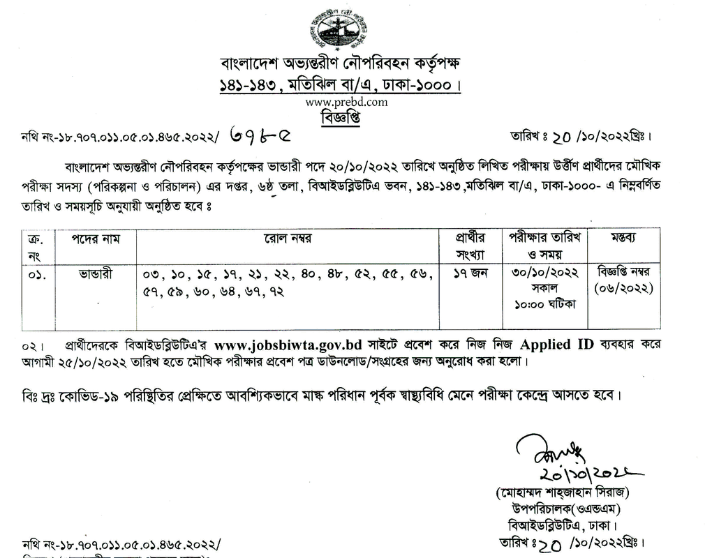 প্রার্থীদেরকে বিআইডব্লিউটিএ’র www.jobsbiwta.gov.bd সাইটে প্রবেশ করে নিজ নিজ Applied ID ব্যবহার করে আগামী ২৫/১০/২০২২ তারিখ হতে মৌখিক পরীক্ষার প্রবেশ পত্র ডাউনলোড/সংগ্রহের জন্য অনুরোধ করা হলো।