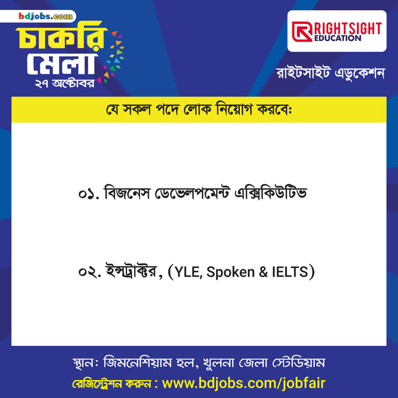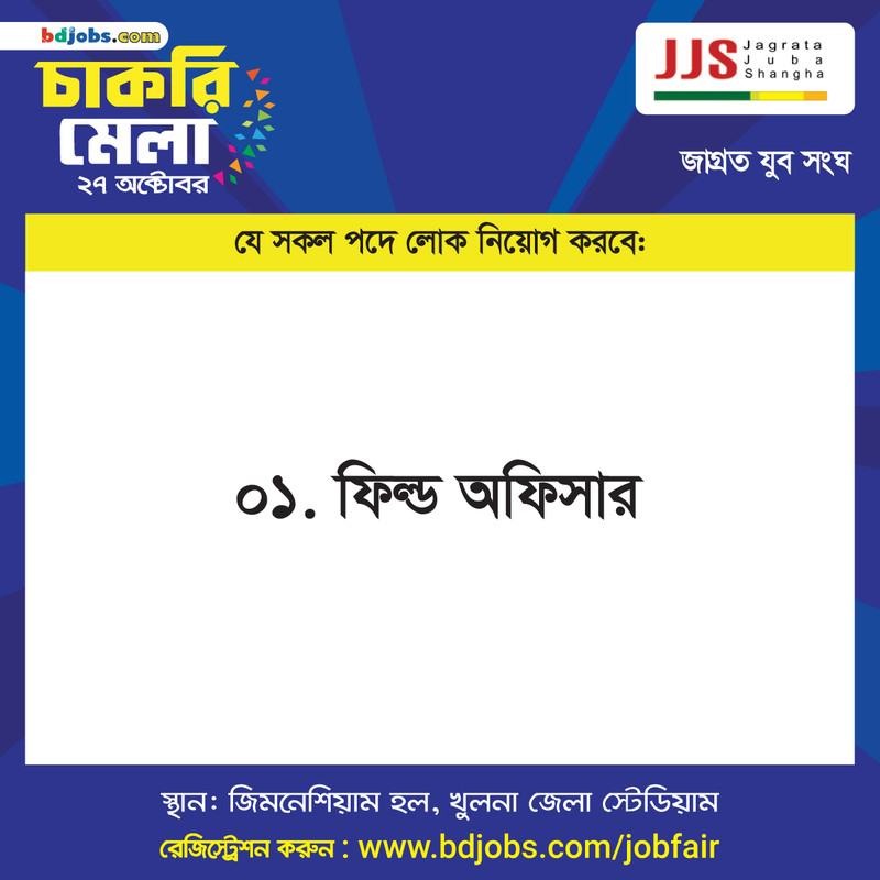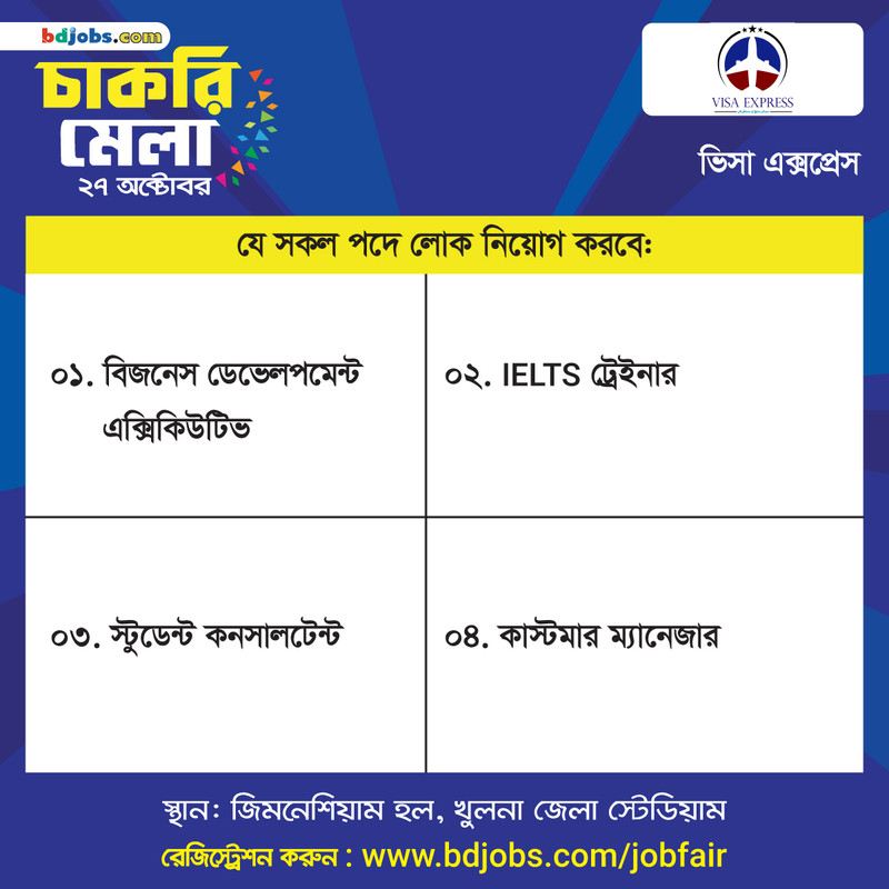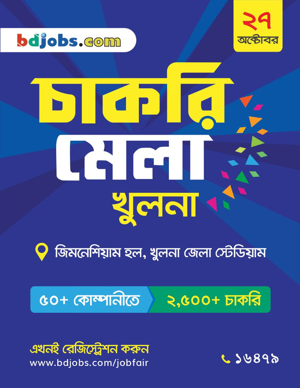 Bdjobs.com আগামী ২৭ অক্টোবর জিমনেসিয়াম হল, খুলনা জেলা স্টেডিয়াম, খুলনা-তে আয়োজন করতে যাচ্ছে দেশের সবচাইতে বড় চাকরি মেলা। অভিজ্ঞ/অনভিজ্ঞ সব ধরনের চাকরী প্রার্থীদের (স্নাতক/ স্নাতকোত্তর, ডিপ্লোমা ডিগ্রীধারী, শেফ, মেকানিক, মেশিন অপারেটর, নার্স, মেডিকেল টেকনোলজিষ্ট সহ যে কোন বিষয়ে পাশ করা/ অভিজ্ঞদের) জন্য ঢাকা ও খুলনার শীর্ষস্থানীয় ৫০ এর অধিক দেশী ও বিদেশী কোম্পানি ২,০০০ + চাকরি দেওয়ার লক্ষ্যে এই মেলায় অংশগ্রহণ করছে।