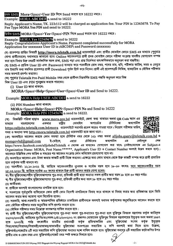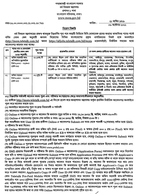 ধর্ম বিষয়ক মন্ত্রণালয়ের রাজস্ব খাতভূক্ত নিম্নবর্ণিত শূন্য পদে অস্থায়ী ভিত্তিতে বিধি মোতাবেক প্রদেয় অন্যান্য ভাতাদিসহ পদের পার্শ্বে বর্ণিত বেতন স্কেল অনুযায়ী জনবল নিয়োগের নিমিত্ত বাংলাদেশের প্রকৃত নাগরিকদের নিকট হতে অনলাইনে (http://mora.teletalk.com.bd ওয়েবসাইটে) নির্ধারিত সময়ের মধ্যে আবেদনপত্র আহবান করা যাচ্ছে।