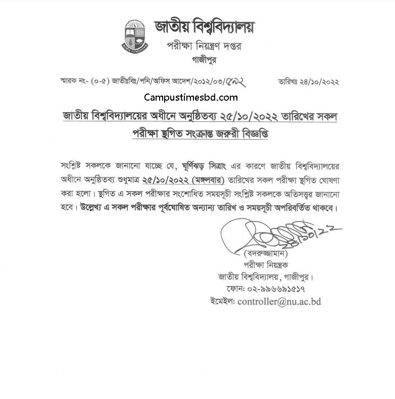 জাতীয় বিশ্ববিদ্যালয়ের অধীনে অনুষ্ঠিতব্য ২৫/১০/২০২২ তারিখের সকল পরীক্ষা স্থগিত সংক্রান্ত জরুরী বিজ্ঞপ্তি।
