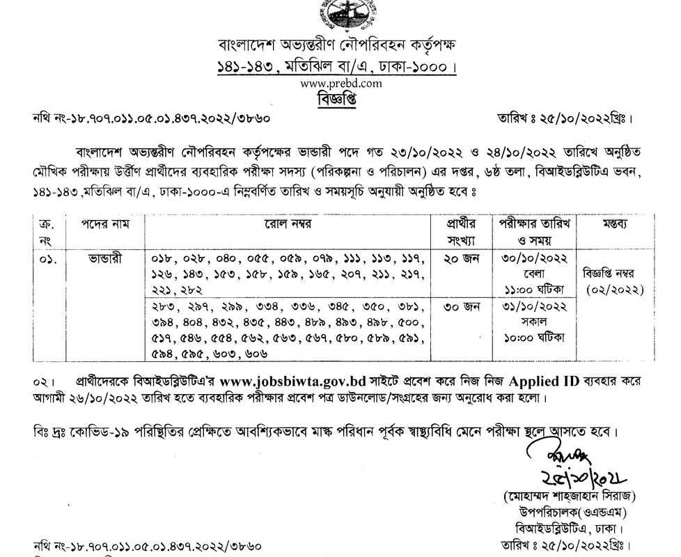 নৌ-পরিবহন কর্তৃপক্ষ (biwta) এর ব্যবহারিক পরীক্ষার সময়সূচী ২০২২