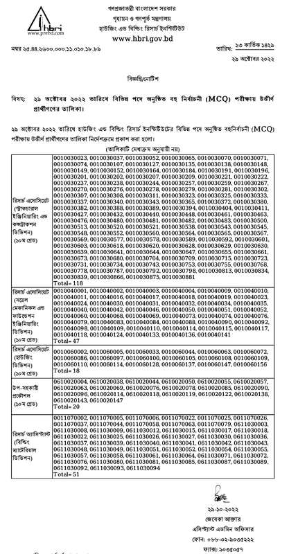 ২৯ অক্টোবর ২০২২ তারিখে বিভিন্ন পদে অনুষ্ঠিত বহু নির্বাচনী (MCQ) পরীক্ষায় উত্তীর্ণ প্রার্থীগণের তালিকা। www.hbri.gov.bd – ২৯ অক্টোবর ২০২২ তারিখে হাউজিং এন্ড বিল্ডিং রিসার্চ ইনস্টিটিউটের বিভিন্ন পদে অনুষ্ঠিত বহুনির্বাচনী (MCQ) পরীক্ষায় উত্তীর্ণ প্রার্থীগণের তালিকা নির্দেশক্রমে প্রকাশ করা হলো। (তালিকাটি মেধাক্রম অনুযায়ী নয়)