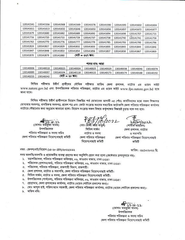 পরিবার পরিকল্পনা অধিদপ্তরাধীন জেলা পরিবার পরিকল্পনা কার্যালয়, নাটোর এর স্মারক নং জেপপ/নাট/নিয়োগ (১৫-২০ গ্রেড)/২০২১/৫৭৩, তারিখ: ৩১/০৮/২০২১ খ্রি. মোতাবেক বিজ্ঞাপিত ০৩ (তিন) ক্যাটাগরি পদে জনবল নিয়োগের নিমিত্ত লিখিত পরীক্ষা গত ২৮ অক্টোবর, ২০২২ খ্রি. তারিখে অনুষ্ঠিত হয়। লিখিত পরীক্ষার ফলাফলের ভিত্তিতে নিম্নবর্ণিত রোল নম্বরধারী প্রার্থীদের মৌখিক পরীক্ষার জন্য নির্বাচিত করা হলো।