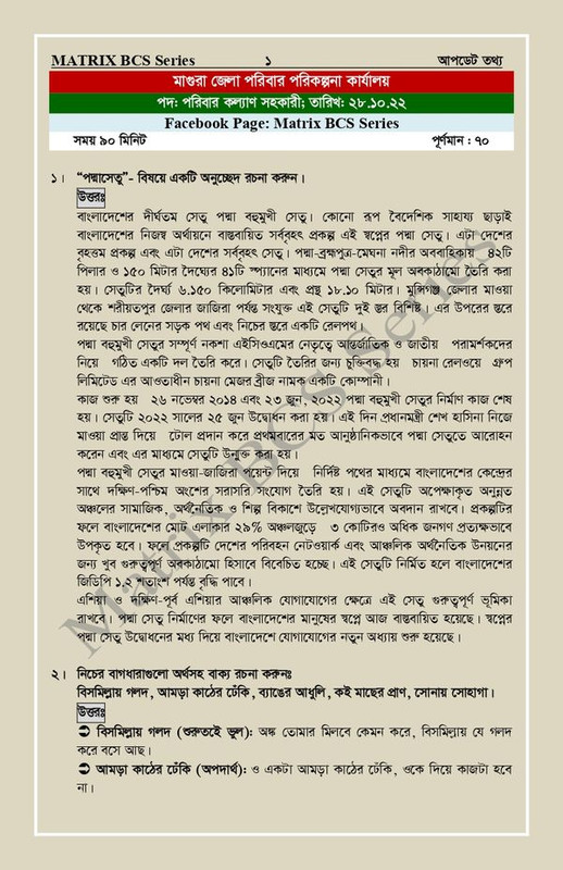 মাগুরা জেলা পরিবার পরিকল্পনা লিখিত পরীক্ষার প্রশ্ন সমাধান ২০২২