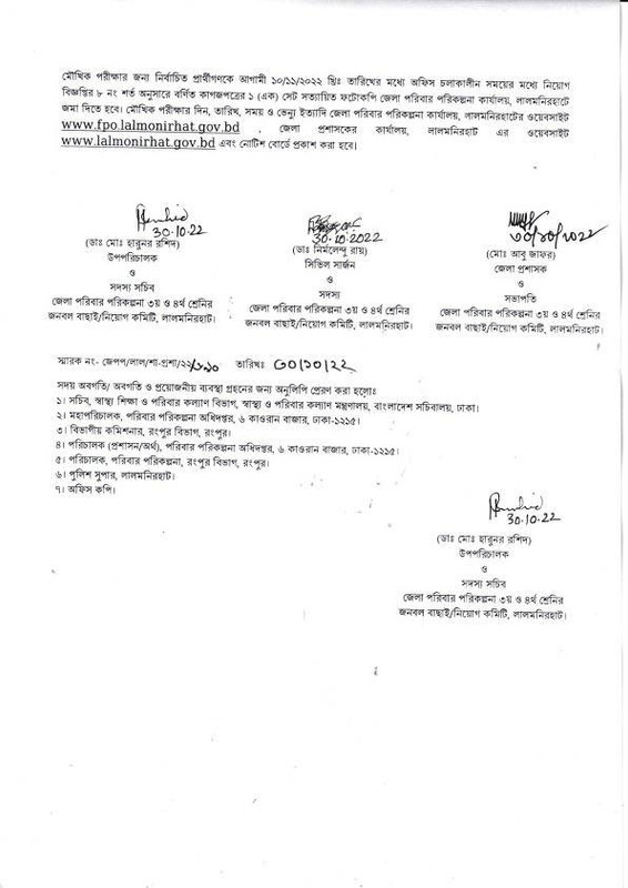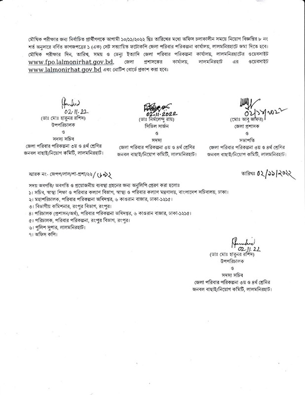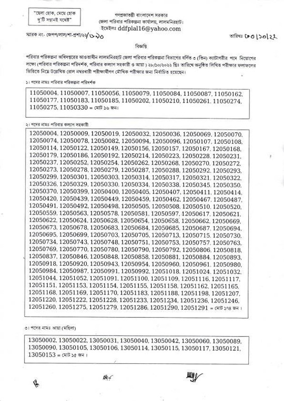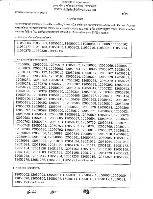 লালমনিরহাট জেলা পরিবার পরিকল্পনা বিভাগের নিয়োগ পরীক্ষার (সংশোধিত) ফলাফল ২০২২