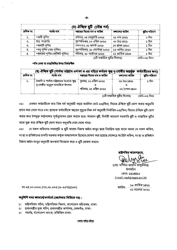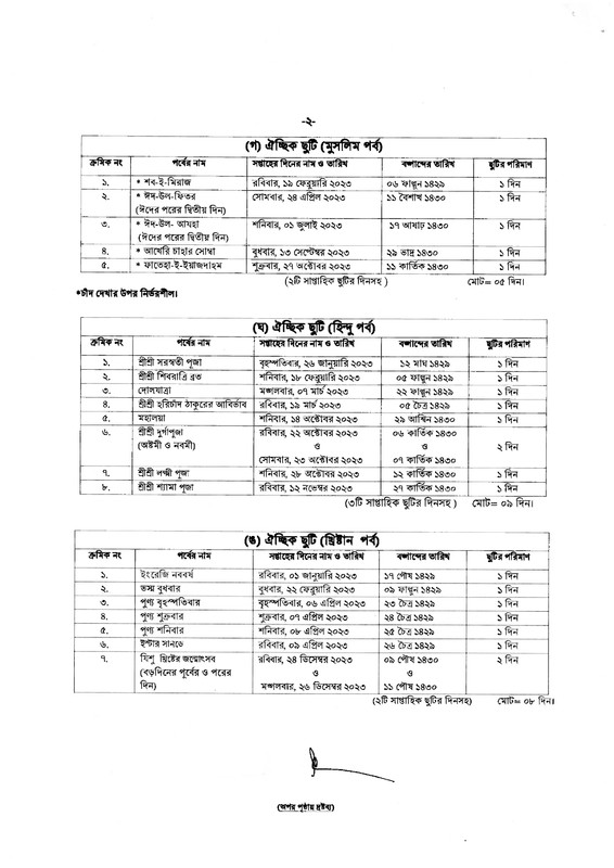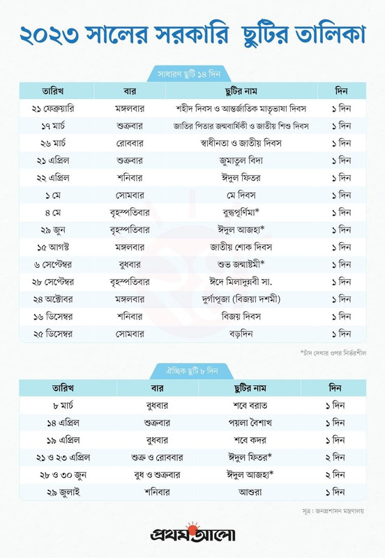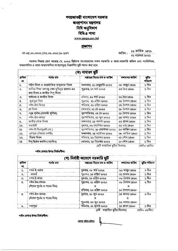 ২০২৩ সালের সরকারি ও আধা-সরকারি অফিসের ছুটির তালিকা