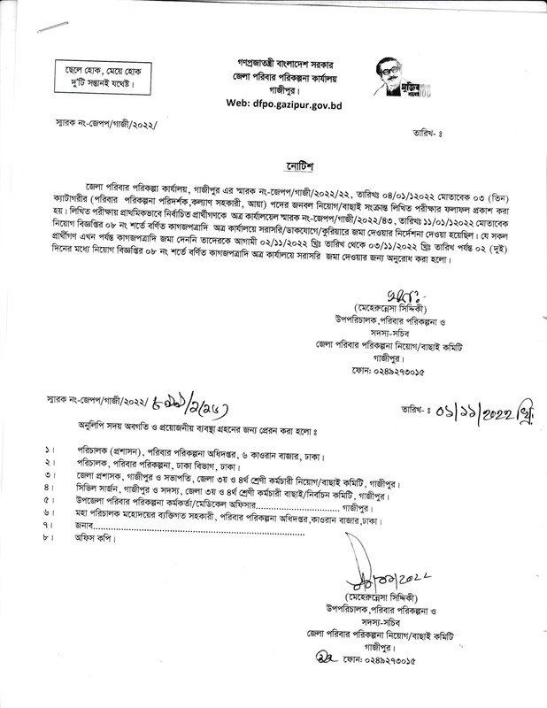 গাজীপুর জেলা পরিবার পরিকল্পা কার্যালয় কাগজপত্র জমাদান ২০২২