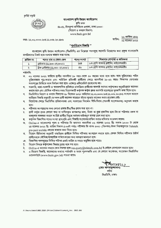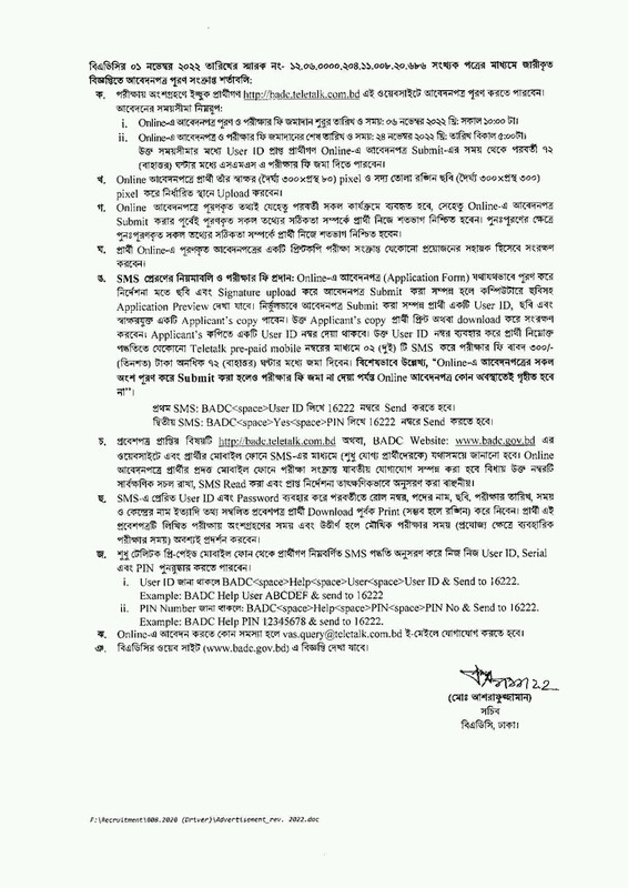 ড. এ নিয়োগ বিজ্ঞপ্তি, আবেদনের অন্যান্য শর্তাবলি ও ফরম পুরণপদ্ধতি এবং যে কোনো সংশোধন, সংযোজন বিএডিসির ওয়েবসাইটে (www.badc.gov.bd) পাওয়া যাবে।