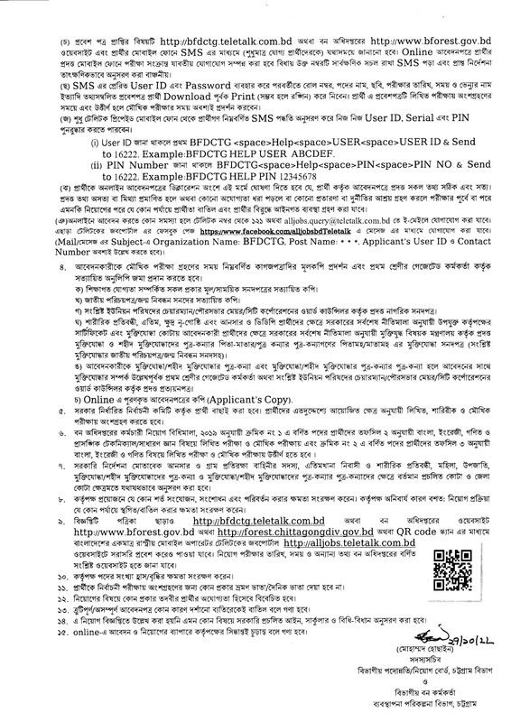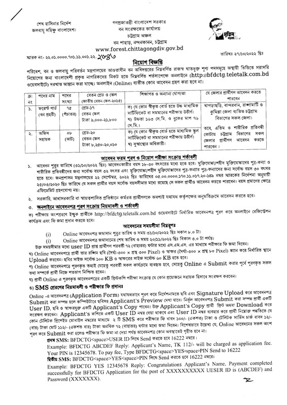 ৮৩ পদে বন সংরক্ষকের কার্যালয়, চট্টগ্রাম অঞ্চল এ নিয়োগ বিজ্ঞপ্তি ২০২২। চট্টগ্রাম বন সংরক্ষকের কার্যালয় নিয়োগ বিজ্ঞপ্তি ২০২২। পরিবেশ, বন ও জলবায়ু পরিবর্তন মন্ত্রণালয়ের আওতাধীন বন অধিদপ্তরের নিম্নবর্ণিত রাজস্ব খাতভূক্ত শূণ্য পদসমূহে অস্থায়ী ভিত্তিতে সরাসরি নিয়োগের জন্য বাংলাদেশী প্রকৃত নাগরিকদের নিকট হতে নিম্নবর্ণিত শর্তসাপেক্ষে অনলাইনে (http://bfdctg.teletalk.com.bd ওয়েবসাইটে) দরখাস্ত আহ্বান করা যাচ্ছে। অনলাইন (Online) ব্যতীত কোন আবেদন গ্রহণ করা হবে না। গণপ্রজাতন্ত্রী বাংলাদেশ সরকার, বন সংরক্ষকের কার্যালয়, চট্টগ্রাম অঞ্চল, বন পাহাড়, নন্দনকানন, চট্টগ্রাম, www.forest.chittagongdiv.gov.bd.