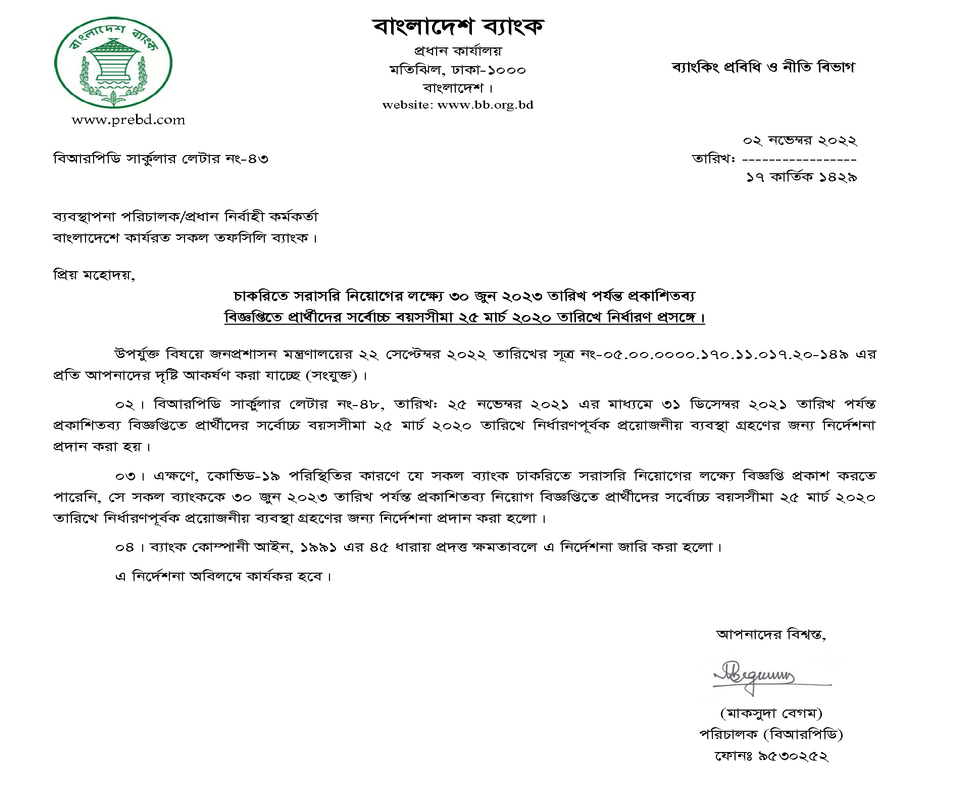 বাংলাদেশ ব্যাংকের অধীনে চাকরিতে প্রবেশের বয়সসীমা ছাড় প্রদান ২০২২