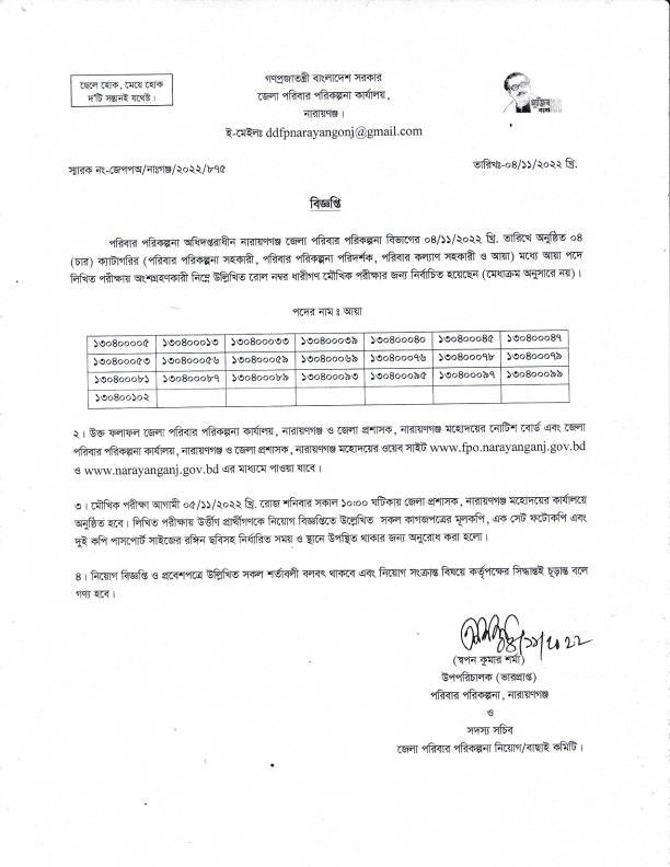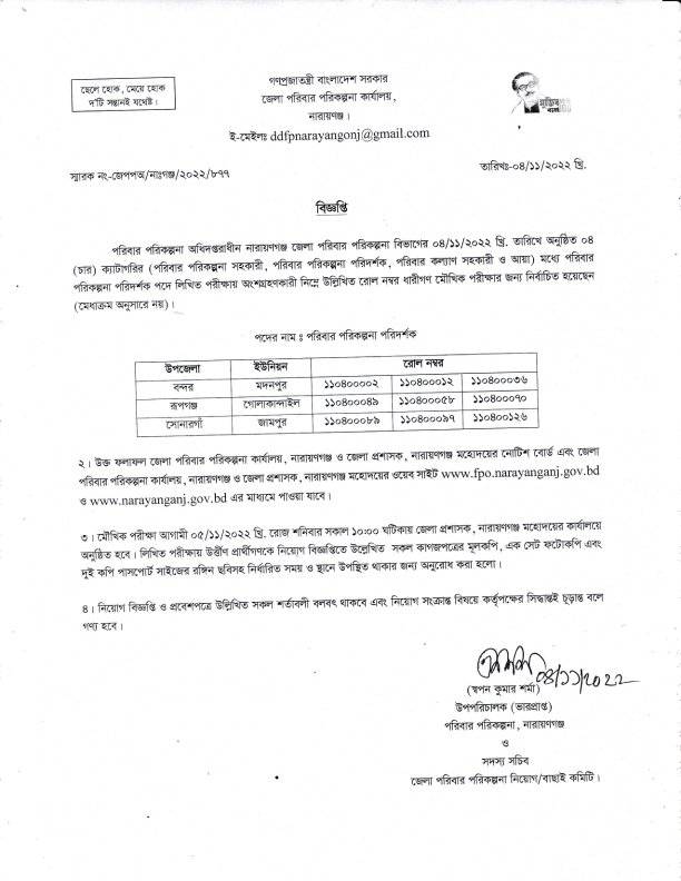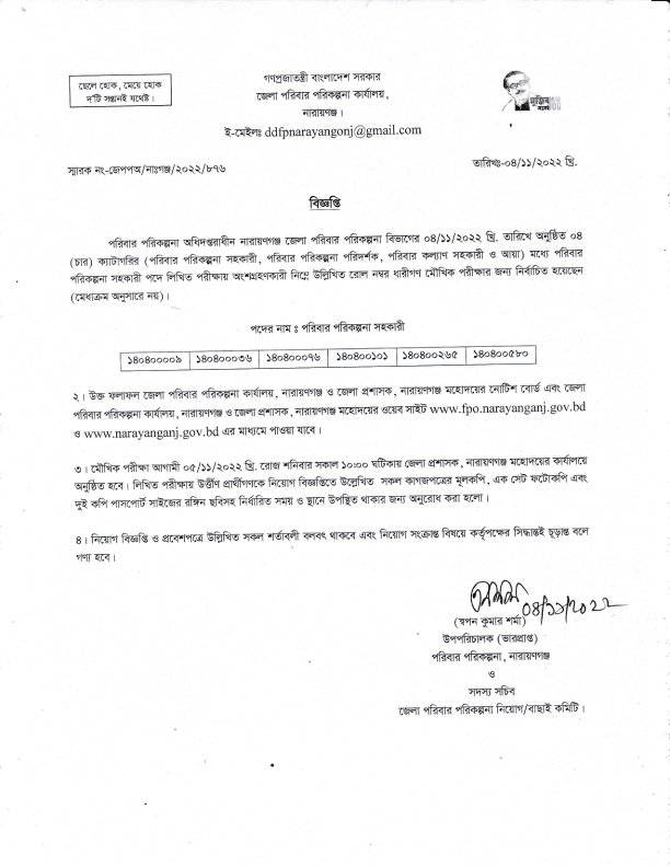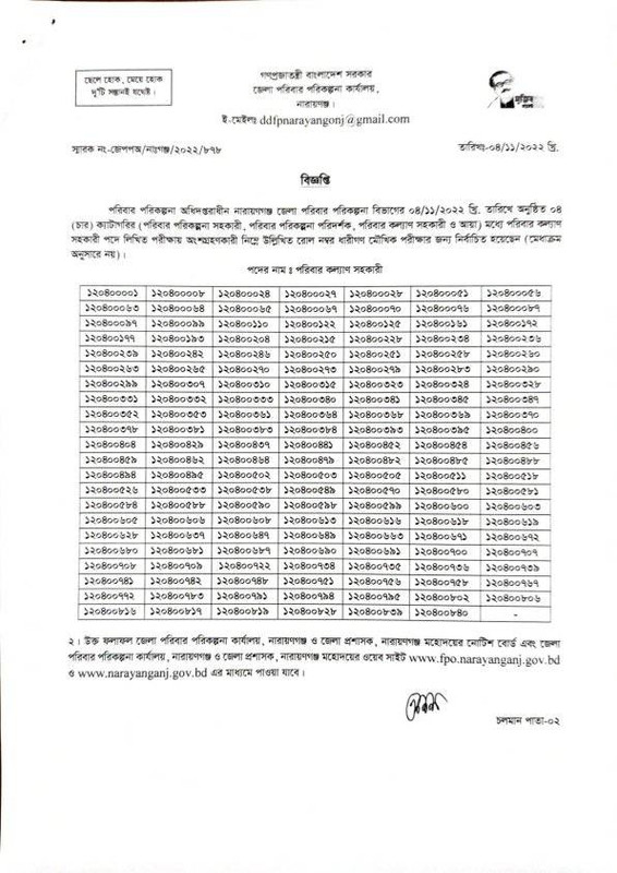নারায়ণগঞ্জ জেলা পরিবার পরিকল্পনা বিভাগের লিখিত পরীক্ষা ফলাফল ২০২২