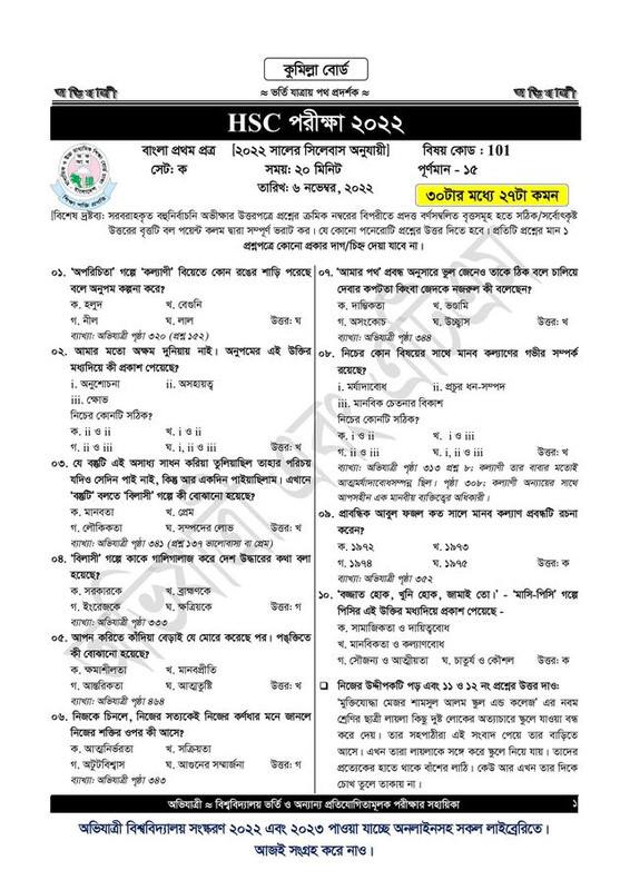 কুমিল্লা বোর্ড’ এর HSC ২০২২ পরীক্ষার নির্ভুল প্রশ্ন সমাধান। তারিখ: ০৬ নভেম্বর, ২০২২। কুমিল্লা বোর্ডের বাংলা ১ম পত্রের MCQ প্রশ্ন সমাধান ২০২২ – Comilla Board HSC Question Solve.