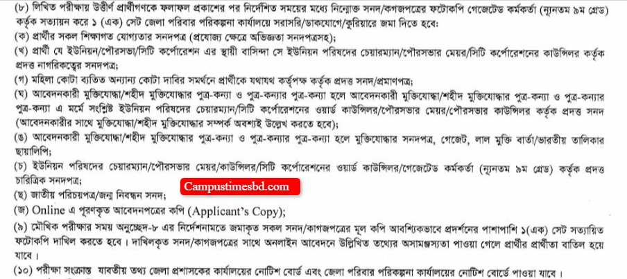 লিখিত পরীক্ষায় উত্তীর্ণ প্রার্থীগণকে ফলাফল প্রকাশের পর নির্দেশিত সময়ের মধ্যে নিম্নোক্ত সনদ/ কগজপত্রের ফটোকপি গেজেটেড কর্মকর্তা (ন্যূনতম ৯ম গ্রেড) কর্তৃক সত্যায়ন করে ১ (এক) সেট জেলা পরিবার পরিকল্পনা কার্যালয়ে সরাসরি/ডাকযোগে/কুরিয়ারে জমা দিতে হবে: