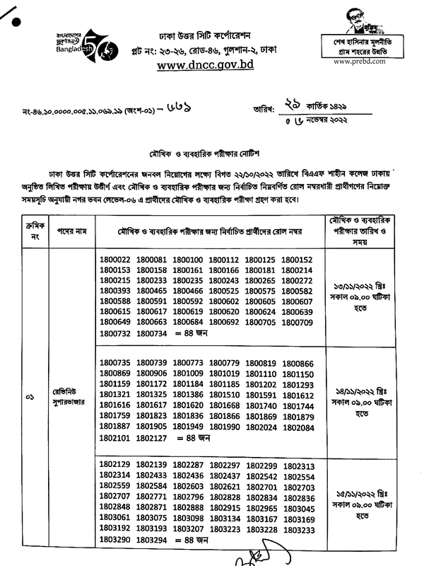 ঢাকা উত্তর সিটি কর্পোরেশনের জনবল নিয়োগের মৌখিক ও ব্যবহারিক পরীক্ষার নোটিশ। ঢাকা উত্তর সিটি কর্পোরেশনের জনবল নিয়োগের লক্ষ্যে বিগত ২২/১০/২০২২ তারিখে বিএএফ শাহীন কলেজ ঢাকায় অনুষ্ঠিত লিখিত পরীক্ষায় উত্তীর্ণ এবং মৌখিক ও ব্যবহারিক পরীক্ষার জন্য নির্বাচিত নিম্নবর্ণিত রোল নম্বরধারী প্রার্থীগণের নিম্নোক্ত সময়সূচি অনুযায়ী নগর ভবন লেভেল-০৬ এ প্রার্থীদের মৌখিক ও ব্যবহারিক পরীক্ষা গ্রহণ করা হবে।