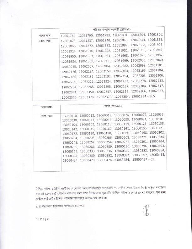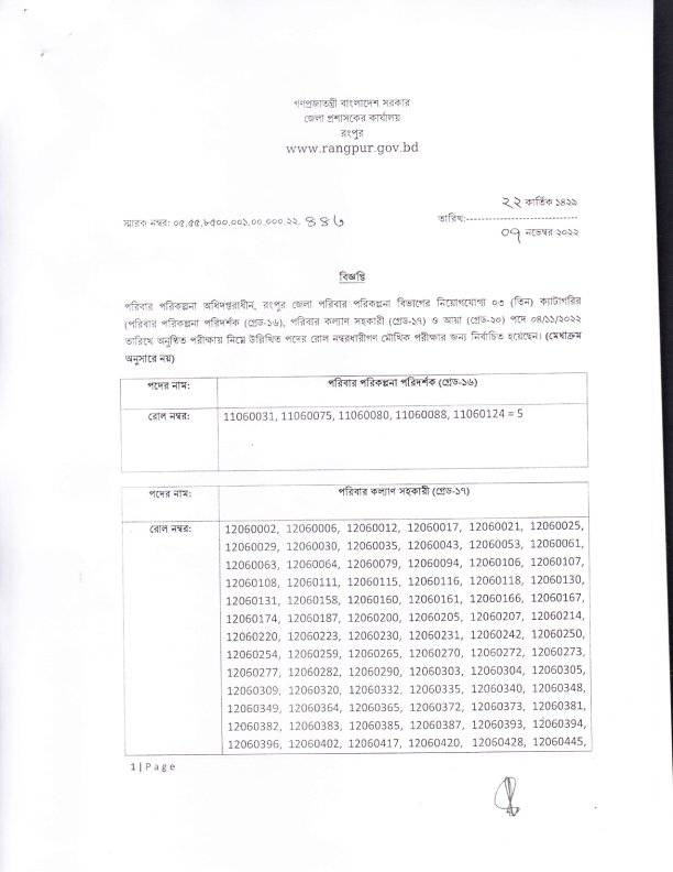 [বি.দ্র: মৌখিক পরীক্ষার সময়সূচি পরবর্তীতে বিজ্ঞপ্তি আকারে জেলা পরিবার পরিকল্পনা কার্যালয়, রংপুর এর নোটিশ বোর্ড এবং ওয়েবসাইট (www.fpo.rangpur.gov.bd) এবং জেলা প্রশাসকের কার্যালয়, রংপুর এর নোটিশ