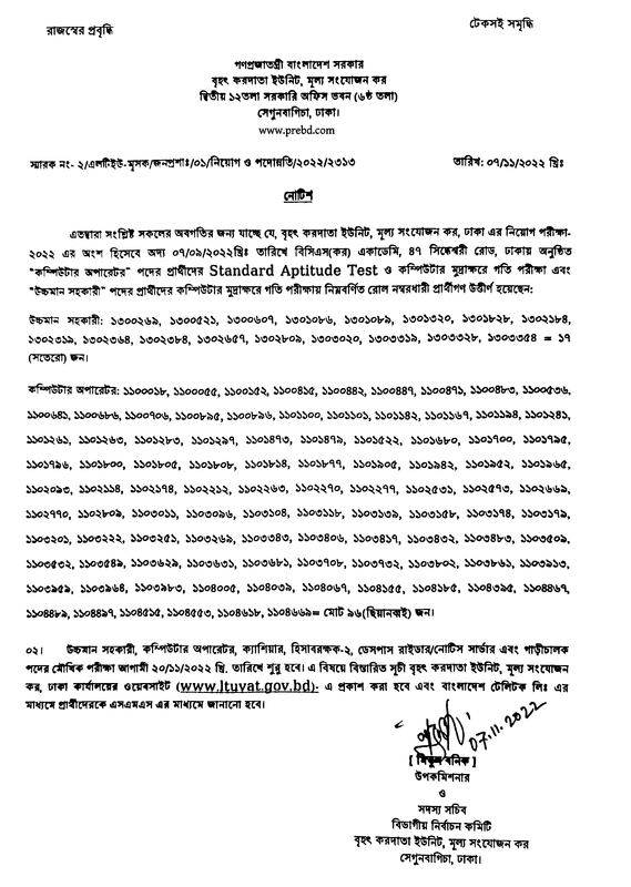 বৃহৎ করদাতা ইউনিট, মূল্য সংযোজন কর এর বিভিন্ন পদের ব্যবহারিক পরীক্ষার ফলাফল ও বিভিন্ন পদের মৌখিক পরীক্ষার সময়সূচী প্রকাশ। পরীক্ষার তারিখঃ ২০ নভেম্বর ২০২২ থেকে শুরু। এতদ্বারা সংশ্লিষ্ট সকলের অবগতির জন্য যাচ্ছে যে, বৃহৎ করদাতা ইউনিট, মূল্য সংযোজন কর, ঢাকা এর নিয়োগ পরীক্ষা- 2022 এর অংশ হিসেবে অদ্য 07/09/2012 খ্রিঃ তারিখে বিসিএস(কর) একাডেমি, ৪৭ সিদ্ধেশ্বরী রোড, ঢাকায় অনুষ্ঠিত কম্পিউটার অপারেটর” পদের প্রার্থীদের Standard Aptitude Test ও কম্পিউটার মুদ্রাক্ষরে গতি পরীক্ষা এবং উচ্চমান সহকারী” পদের প্রার্থীদের কম্পিউটার মুদ্রাক্ষরে গতি পরীক্ষায় নিম্নবর্ণিত রোল নম্বরধারী প্রার্থীগণ উত্তীর্ণ হয়েছেন।