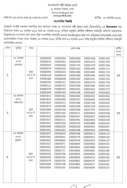 বাংলাদেশ পল্লী উন্নয়ন বোর্ড (brdb) এর হিসাবরক্ষক পদের মৌখিক পরীক্ষার সময়সূচি (সংশোধিত) ২০২২। হিসাবরক্ষক পদের মৌখিক পরীক্ষার তারিখঃ ২৮ নভেম্বর – ৩ ডিসেম্বর ২০২২। এতদ্বারা সংশ্লিষ্ট সকলের অবগতির জন্য জানানো যাচ্ছে যে, বাংলাদেশ পল্লী উন্নয়ন বোর্ড (বিআরডিবি) এর হিসাবরক্ষক পদে নিয়োগের লক্ষ্যে ১৩ নভেম্বর ২০২২ হতে ১৯ নভেম্বর ২০২২ তারিখে অনুষ্ঠেয় মৌখিক পরীক্ষার সময়সূচি অনিবার্য কারণবশত: নিমোক্তভাবে সংশোধন করা হলো। উক্ত বিজ্ঞপ্তি www.brdb.gov.bd ওয়েবসাইটেও পাওয়া যাবে। উল্লেখ্য, ২০ নভেম্বর ২০২২ তারিখ হতে ২৬ নভেম্বর ২০২২ পর্যন্ত অনুষ্ঠেয় মৌখিক পরীক্ষার সময়সূচি অপরিবর্তিত থাকবে।