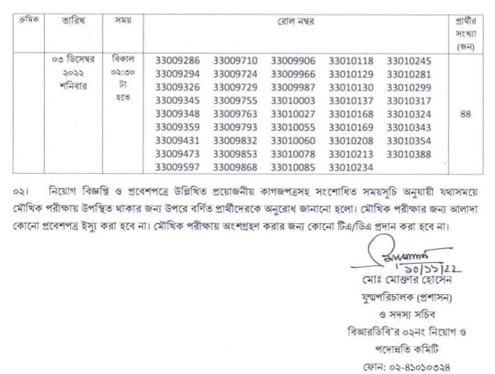 নিয়োগ বিজ্ঞপ্তি ও প্রবেশপত্রে উল্লিখিত প্রয়োজনীয় কাগজপত্রসহ সংশোধিত সময়সূচি অনুযায়ী যথাসময়ে মৌখিক পরীক্ষায় উপস্থিত থাকার জন্য উপরে বর্ণিত প্রার্থীদেরকে অনুরোধ জানানো হলো। মৌখিক পরীক্ষার জন্য আলাদা কোনো প্রবেশপত্র ইস্যু করা হবে না। মৌখিক পরীক্ষায় অংশগ্রহণ করার জন্য কোনো টিএ/ডিএ প্রদান করা হবে না।