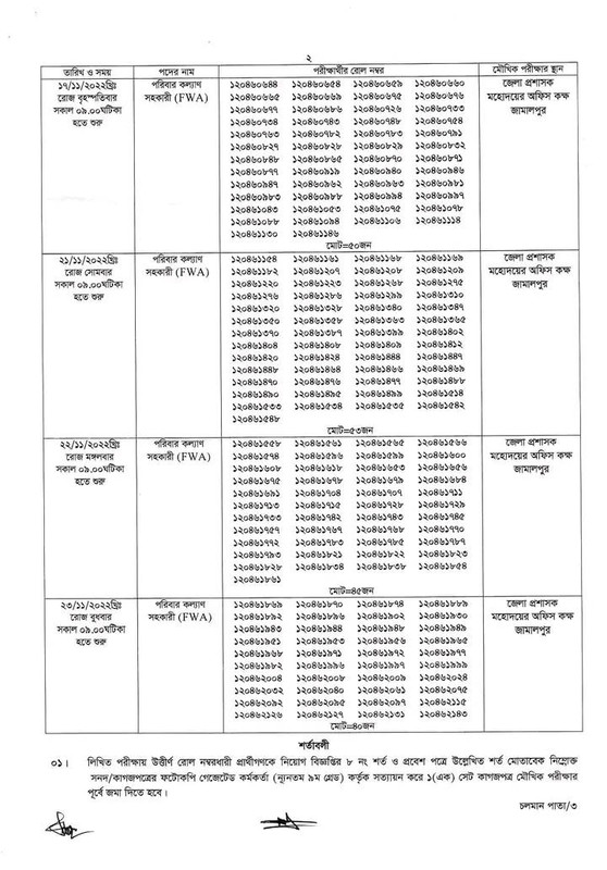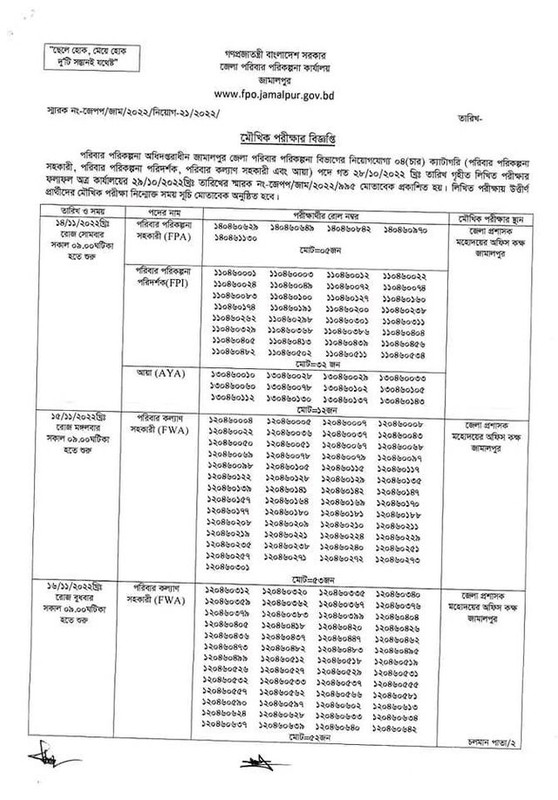 জেলা পরিবার পরিকল্পনা কার্যালয়, জামালপুর মৌখিক পরীক্ষার তারিখ ১৪-১১-২০২২ তারিখ থেকে ২৩-১১-২০২২ তারিখ পর্যন্ত। পরিবার পরিকল্পনা অধিদপ্তরাধীন জামালপুর জেলা পরিবার পরিকল্পনা বিভাগের নিয়োগযোগ্য ০৪ (চার) ক্যাটাগরি (পরিবার পরিকল্পনা সহকারী, পরিবার পরিকল্পনা পরিদর্শক, পরিবার কল্যাণ সহকারী এবং আয়া) পদে গত ২৮/১০/২০২২ খ্রিঃ তারিখ গৃহীত লিখিত পরীক্ষার ফলাফল অত্র কার্যালয়ের ২৯/১০/২০১২খ্রিঃ তারিখের স্মারক নং-জেপপ / জাম / ২০২২/৯৯৫ মোতাবেক প্রকাশিত হয়। লিখিত পরীক্ষায় উত্তীর্ণ প্রার্থীদের মৌখিক পরীক্ষা নিম্নোক্ত সময় সূচি মোতাবেক অনুষ্ঠিত হবে।