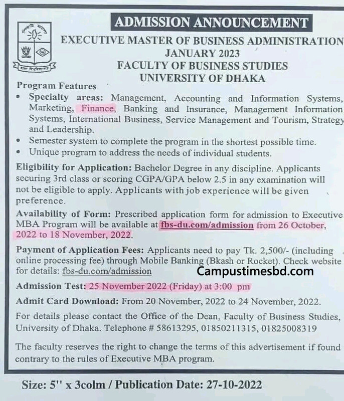 ADMISSION ANNOUNCEMENT, EXECUTIVE MASTER OF BUSINESS ADMINISTRATION, JANUARY 2023. FACULTY OF BUSINESS STUDIES, UNIVERSITY OF DHAKA. Executive MBA Dhaka University MBA Admission Circular, Dhaka University.
