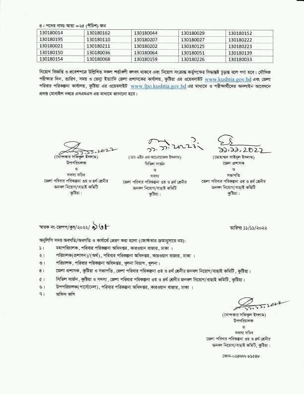 নিয়োগ বিজ্ঞপ্তি ও প্রবেশপত্রে উল্লিখিত সকল শর্তাবলী কাব্য থাকবে এবং নিয়োগ সংক্রান্ত কর্তৃপক্ষের সিদ্ধান্তই চূড়ান্ত বলে গণ্য হবে। মৌখিক পরীক্ষার দিন, তারিখ, সময় ও ভেন্যু ইত্যাদি জেলা প্রশাসকের কার্যালয়, কুষ্টিয়া এর ওয়েবসাইট www.kushtia.gov.bd এবং জেলা পরিবার পরিকল্পনা কার্যালয়, কুষ্টিয়া এর ওয়েবসাইট www.fpo.kushtia.gov.bd এর মাধ্যমে ও পরীক্ষার্থীদের অনলাইন আবেদনে প্রদত্ত মোবাইল নম্বরে এসএমএস এর মাধ্যমে জানানো হবে।