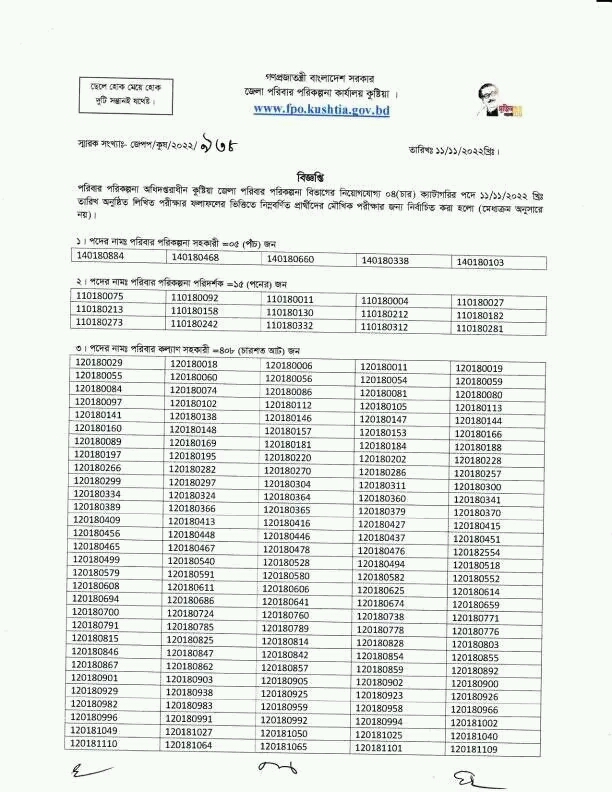 কুষ্টিয়া জেলা পরিবার পরিকল্পনা পরীক্ষার ফলাফল ২০২২ – dgfp Kushtia Results. পরিবার পরিকল্পনা অধিদপ্তরাধীন কুষ্টিয়া জেলা পরিবার পরিকল্পনা বিভাগের নিয়োগযোগ্য ০৪ (চার) ক্যাটাগরির পদে ১১/১১/২০২২ তারিখ অনুষ্ঠিত লিখিত পরীক্ষার ফলাফলের ভিত্তিতে নিম্নবর্ণিত প্রার্থীদের মৌখিক পরীক্ষার জন্য নির্বাচিত করা হলো (মেধাক্রম অনুসারে নয়)।