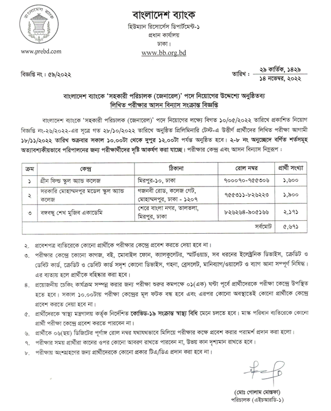 Bangladesh Bank AD Written Seat Plan 2022. Bangladesh Bank Assistant Director (General) Written Exam Schedule and Seat Arrangement. The exam date for the post of Assistant Director (General) is 18 November 2022. Circular on seat plan of written examination for the post of ‘Assistant Director(General)’ of Bangladesh Bank.