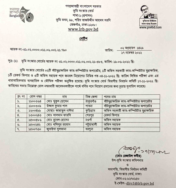 ভূমি সংস্কার বোর্ড নিয়োগ পরীক্ষার চূড়ান্ত ফলাফল ২০২২