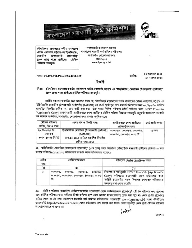 নৌপরিবহন মন্ত্রণালয়ের অধীন বাংলাদেশ মেরিন একাডেমি, চট্রগ্রাম এর ইঞ্জিনিয়ারিং মেকানিক [উপসহকারী প্রকৌশলী] [১০ম গ্রেড] পদের প্রার্থীদের মৌখিক পরীক্ষার সময়সূচি।