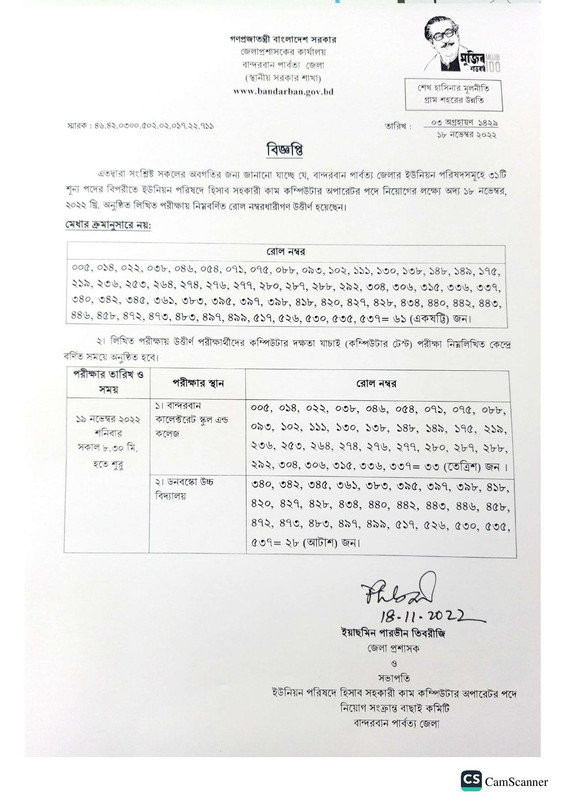 এতদ্বারা সংশ্লিষ্ট সকলের অবগতির জন্য জানানো যাচ্ছে যে, বান্দরবান পার্বত্য জেলার ইউনিয়ন পরিষদসমূহে ৩১টি শূন্য পদের বিপরীতে ইউনিয়ন পরিষদে হিসাব সহকারী কাম কম্পিউটার অপারেটর পদে নিয়োগের লক্ষ্যে অদ্য ১৮ নভেম্বর, ২০২২ খ্রি. অনুষ্ঠিত লিখিত পরীক্ষায় নিম্নবর্ণিত রোল নম্বরধারীগণ উত্তীর্ণ হয়েছেন। মেধার ক্রমানুসারে নয়।