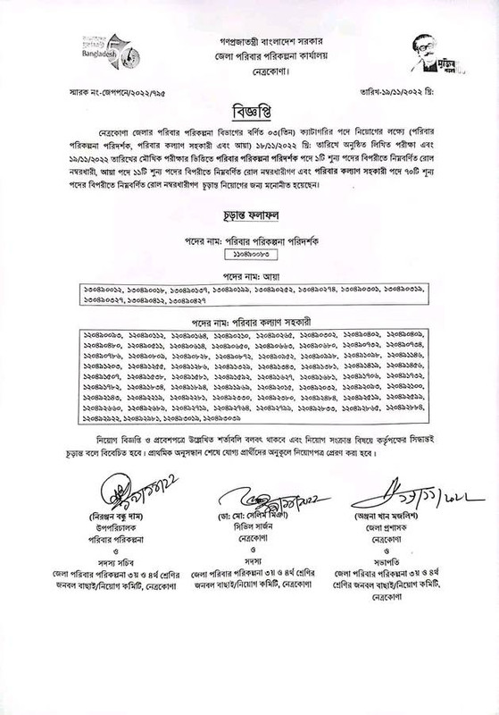 নেত্রকোণা জেলার পরিবার পরিকল্পনা বিভাগের বর্ণিত ০৩ (তিন) ক্যাটাগরির পদে নিয়োগের লক্ষ্যে (পরিবার পরিকল্পনা পরিদর্শক, পরিবার কল্যাণ সহকারী এবং আয়া) 18/11/2012 খ্রি: তারিখে অনুষ্ঠিত লিখিত পরীক্ষা এবং ১৯/১১/২০২২ তারিখের মৌখিক পরীক্ষার ভিত্তিতে পরিবার পরিকল্পনা পরিদর্শক পদে ১টি শূন্য পদের বিপরীতে নিম্নবর্ণিত রোল নম্বরধারী, আয়া পদে ১১টি শূন্য পদের বিপরীতে নিম্নবর্ণিত রোল নম্বরধারীগণ এবং পরিবার কল্যাণ সহকারী পদে ৭০টি শূন্য পদের বিপরীতে নিম্নবর্ণিত রোল নম্বরধারীগণ চূড়ান্ত নিয়োগের জন্য মনোনীত হয়েছেন।