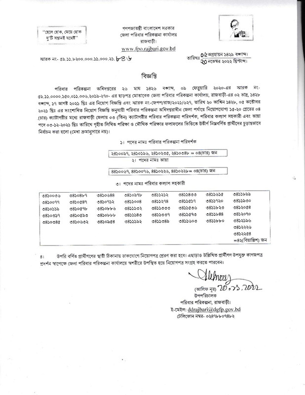 জেলা পর্যায়ে নিয়োগযোগ্য ১৫-২০ গ্রেডের ০৪ (চার) ক্যাটাগরীর মধ্যে রাজবাড়ী জেলায় ০৩ (তিন) ক্যাটাগরীর পরিবার পরিকল্পনা পরিদর্শক, পরিবার কল্যাণ সহকারী এবং আয়া পদে ০৩-১২-২০২১ খ্রিঃ তারিখে গৃহীত লিখিত পরিক্ষা ও মৌখিক পরিক্ষার ফলাফলের ভিত্তিতে উত্তীর্ণ নিম্নবর্ণিত প্রার্থীদের চুড়ান্তভাবে নির্বাচন করা হলো (মেধা ক্রমানুসারে নয়)।