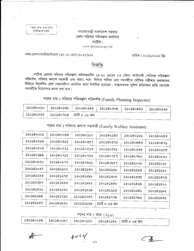 নাটোর জেলায় পরিবার পরিকল্পনা অধিদপ্তরাধীন ১৫-২০ গ্রেডের ০৩ (তিন) ক্যাটাগরী (পরিবার পরিকল্পনা পরিদর্শক, পরিবার কল্যাণ সহকারী এবং আয়া) পদে লিখিত পরীক্ষা এবং পরবর্তীতে মৌখিক পরীক্ষার ফলাফলের ভিত্তিতে নিম্নবর্ণিত রোল নম্বরধারীগণ প্রাথমিক ভাবে নির্বাচিত হয়েছেন। সন্তোষজনক পুলিশ প্রতিবেদন প্রাপ্তি সাপেক্ষে পরবর্তীতে নিয়োগপত্র প্রদান করা হবে।