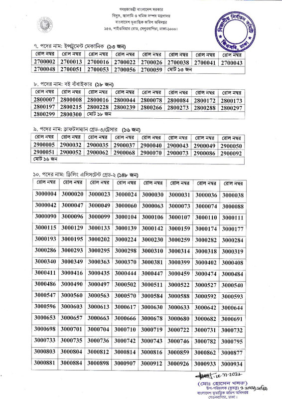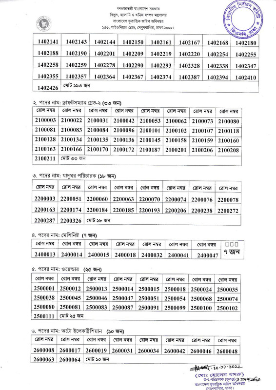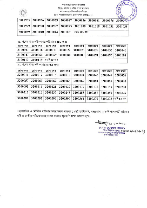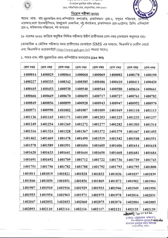 ফটোজিওলজিক টেকনিশিয়ান, সার্ভেয়ার, পরীক্ষাগার সহকারী, ফটোগ্রাফার, ভূপদার্থিক সহকারী, মাড তত্ত্বাবধায়ক, এসিসটেন্ট লাইব্রেরীয়ান ও অফিস সহায়ক। ১০ মে ২০২৪ তারিখে অনুষ্ঠিত লিখিত পরীক্ষায় উত্তীর্ণ প্রার্থীগণের রোল নম্বর (মেধাক্রম অনুসারে নয়)। (মৌখিক পরীক্ষার সময়সূচী প্রার্থীগণের মোবাইলে SMS এর মাধ্যমে, জিএসবি’র নোটিশ বোর্ডে এবং জিএসবি’র ওয়েবসাইটে (http://www.gsb.gov.bd) পাওয়া যাবে।) মৌখিক পরীক্ষার সময় সকল সনদের সত্যায়িত ১ সেট ফটোকপি, সদ্যতোলা ২ কপি পাসপোর্ট সাইজের ছবি, জাতীয় পরিচয়পত্র ও নাগরিকত্ব সনদ জমা দিতে হবে। এছাড়া সকল সনদের মূলকপি ও অভিজ্ঞতার সনদ (প্রযোজ্য ক্ষেত্রে) সঙ্গে আনতে হবে।