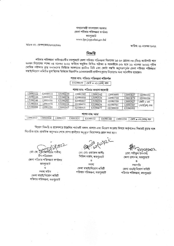 জেলা পরিবার পরিকল্পনা কার্যালয় জয়পুরহাট এর চাকরির পরীক্ষার চূড়ান্ত ফলাফল প্রকাশ। পরিবার পরিকল্পনা অধিদপ্তরাধীন জয়পুরহাট জেলা পরিবার পরিকল্পনা বিভাগের ১৫-২০ গ্রেডের ০৩ (তিন) ক্যাটাগরি পদে জনবল নিয়োগের লক্ষ্যে ০৪ নভেম্বর ২০২২ তারিখে অনুষ্ঠিত লিখিত পরীক্ষা ও পরবর্তীতে (০৯ হতে ১৬ নভেম্বর ২০২২) গৃহীত মোখিক পরীক্ষায় প্রাপ্ত ফলাফলের ভিত্তিতে সরকারের প্রচলিত বিধি এবং কোটা পদ্ধতি অনুসরণপূর্বক জেলা পরিবার পরিকল্পনা