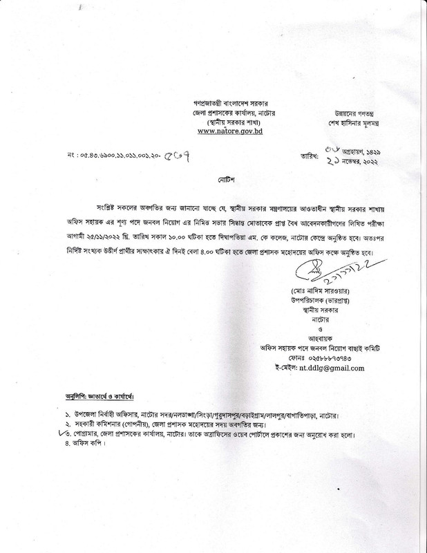 জেলা প্রশাসকের কার্যালয় নাটোর জেলার চাকরির পরীক্ষার সময়সূচি। পদের নামঃ অফিস সহায়ক, পরীক্ষার তারিখঃ ২৫-১১-২০২২।পরীক্ষার সময়ঃ সকাল ১০.০০ টা। সংশ্লিষ্ট সকলের অবগতির জন্য জানানো যাচ্ছে যে, স্থানীয় সরকার মন্ত্রণালয়ের আওতাধীন স্থানীয় সরকার শাখায় অফিস সহায়ক এর শূণ্য পদে জনবল নিয়োগ এর নিমিত্ত সভার সিদ্ধান্ত মোতাবেক প্রাপ্ত বৈধ আবেদনকারীগণের লিখিত পরীক্ষা আগামী 25/11/2012 খ্রি. তারিখ সকাল ১০.০০ ঘটিকা হতে দিঘাপতিয়া এম. কে কলেজ, নাটোর কেন্দ্রে অনুষ্ঠিত হবে। অতঃপর