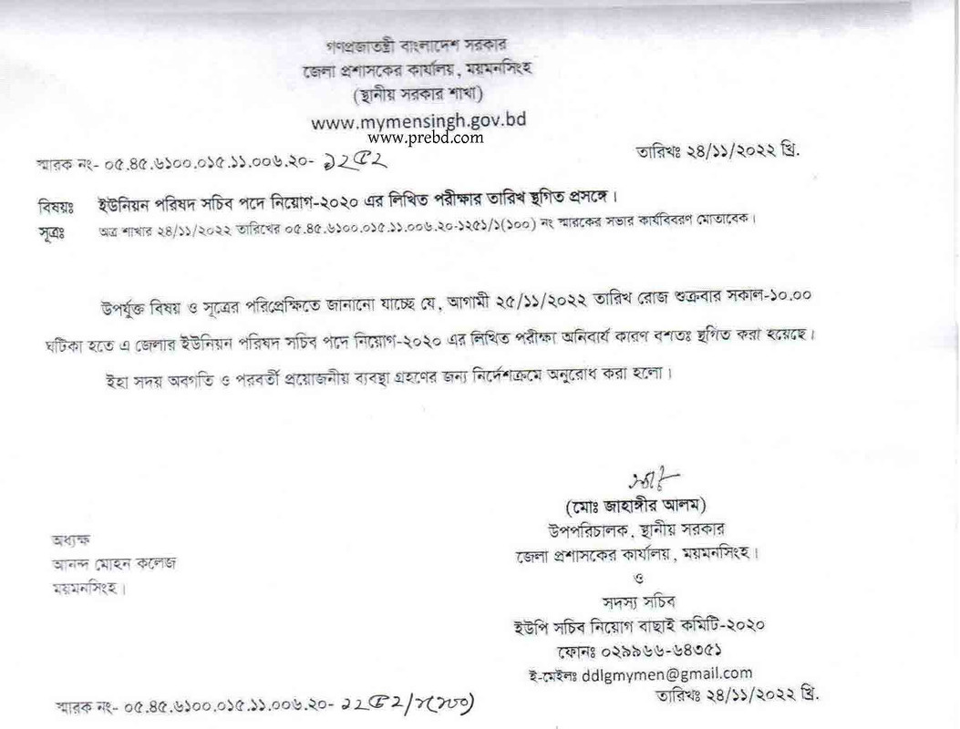 ময়মনসিংহের জেলা প্রশাসকের কার্যালয় ইউনিয়ন পরিষদ সচিব পরীক্ষা স্থগিত ২০২২