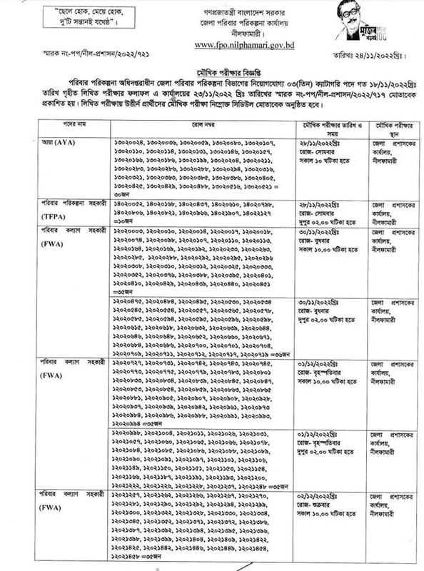 পরিবার পরিকল্পনা অধিদপ্তরাধীন জেলা পরিবার পরিকল্পনা বিভাগের নিয়োগযোগ্য ০৩ (তিন) ক্যাটাগরি পদে গত ১৮/১১/২০২২ খ্রিঃ তারিখ গৃহীত লিখিত পরীক্ষার ফলাফল এ কার্যালয়ের ২৩/১১/২০২২ খ্রিঃ তারিখের স্মারক নং-পপ/ নীল – প্রশাসন / ২০২২ / ৭১৭ মোতাবেক প্রকাশিত হয়। লিখিত পরীক্ষায় উত্তীর্ণ প্রার্থীদের মৌখিক পরীক্ষা নিম্নোক্ত সিডিউল মোতাবেক অনুষ্ঠিত হবে।