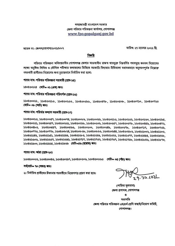 পরিবার পরিকল্পনা অধিদপ্তরাধীন গোপালগঞ্জ জেলার আওতাধীন রাজস্ব খাতভুক্ত নিম্নবর্ণিত পদসমূহে জনবল নিয়োগের লক্ষ্যে অনুষ্ঠিত লিখিত ও মৌখিক পরীক্ষার ফলাফলের ভিত্তিতে সরকারি বিদ্যমান নীতিমালা যথাযথভাবে অনুসরণপূর্বক নিম্নোক্ত নম্বরধারী প্রার্থীদের নিয়োগের জন্য চূড়ান্তভাবে নির্বাচিত করা হলো।