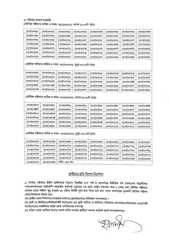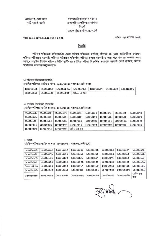 পরিবার পরিকল্পনা সহকারী, পরিবার পরিকল্পনা পরিদর্শক, পরিবার কল্যাণ সহকারী ও আয়া পদে গত ২৫ নভেম্বর ২০22 তারিখে অনুষ্ঠিত লিখিত পরীক্ষায় উত্তীর্ণ প্রার্থীগণের মৌখিক পরীক্ষা নিম্নবর্ণিত সময়সূচি অনুযায়ী জেলা প্রশাসক, সিলেট মহোদয়ের কার্যালয়ে অনুষ্ঠিত হবে।
