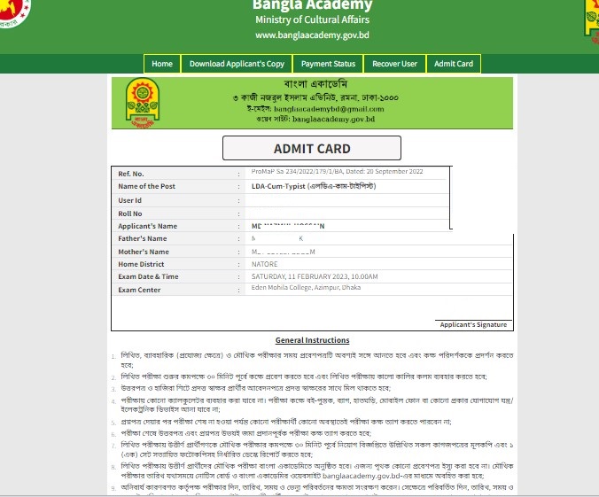 Bangla ACADEMY Admit Download Link: