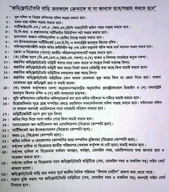 ১. সর্বপ্রথম আপনাকে দেখতে হবে যে ডেভেলপার প্রতিস্টানের থেকে ফ্ল্যাট কিনতে চাচ্ছেন উক্ত ডেভেলপার প্রতিস্টানটি কি আইনানুগ নিবন্ধিত কিনা