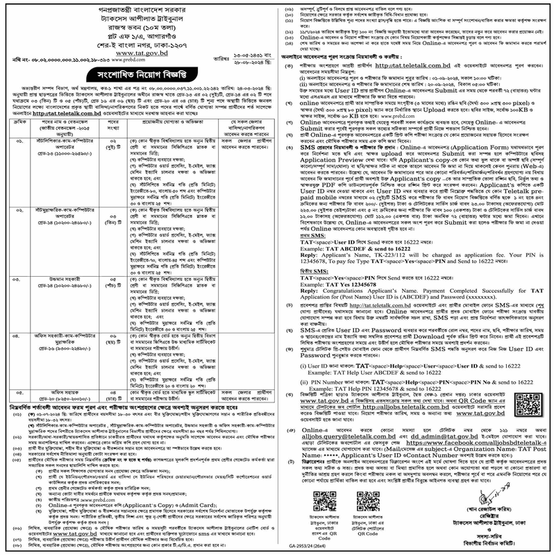অভ্যন্তরীণ সম্পদ বিভাগ, অর্থ মন্ত্রণালয়, কর-১ শাখা ২৪-০৩-২০২৪ খ্রি: অনুযায়ী প্রাপ্ত ছাড়পত্রের ভিত্তিতে ট্যাকসেস আপীলাত ট্রাইবুনালের অধীনে রাজস্ব খাতে গ্রেড-১৩ এর ০২ (দুই)টি, গ্রেড-১৪ এর ০২ টি পদে যথাক্রমে ০৩ (তিন) টি ও ০৫ (পাঁচ)টি, গ্রেড ১৬ এর ০৬ (ছয়) টি এবং গ্রেড-২০ এর ০৪ (চার) টি শূন্য পদে অস্থায়ী ভিত্তিতে জনবল নিয়োগের লক্ষ্যে বাংলাদেশের প্রকৃত স্থায়ী বাসিন্দা/নাগরিকগণের নিকট হতে পদের পার্শ্বে বর্ণিত যোগ্যতা সম্পন্ন প্রার্থীদের শর্ত সাপেক্ষে অনলাইনে http://tat.teletalk.com.bd ওয়েবসাইটের মাধ্যমে দরখাস্ত আহবান করা যাচ্ছে।