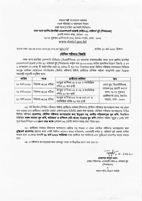 ০২। শর্ট-লিস্টেড (লিখিত পরীক্ষায় উত্তীর্ণ) প্রার্থীদের বর্তমান ঠিকানায় মৌখিক পরীক্ষায় অংশগ্রহণের জন্য পত্র প্রেরণ করা হয়েছে এবং প্রার্থীদের মোবাইল ফোনে এতদসংক্রান্ত SMS প্রেরণ করা হয়েছে। মৌখিক পরীক্ষায় অংশগ্রহণের নিমিত্ত লিখিত পরীক্ষার প্রবেশপত্র, মৌখিক পরীক্ষায় অংশগ্রহণের জন্য ইস্যুকৃত পত্র, জাতীয় পরিচয়পত্রের মূল কপি, বিজ্ঞপ্তিতে উল্লিখিত সকল সনদের মূল কপি, অভিজ্ঞতা ও প্রশিক্ষণ (যদি থাকে) সংক্রান্ত মুল কপি মৌখিক পরীক্ষা শুরুর ১ (এক) ঘন্টা পূর্বে ডিএমটিসিএল-এর ১৪০৭ নম্বর কক্ষে (লেভেল-১৪, প্রবাসী কল্যাণ ভবন) জমা দিতে হবে।