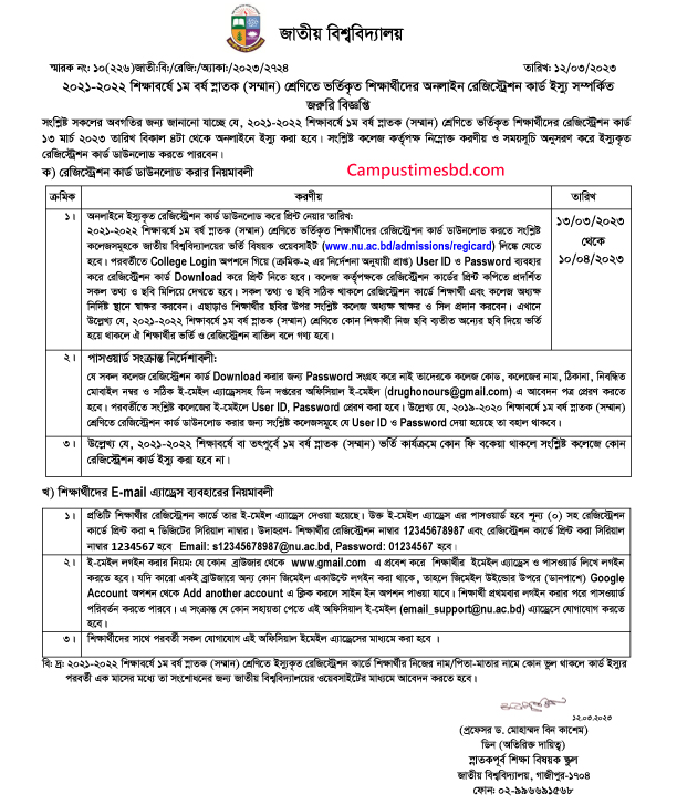 অনার্স ১ম বর্ষের রেজিষ্ট্রেশন কার্ড ইস্যু ২০২৩