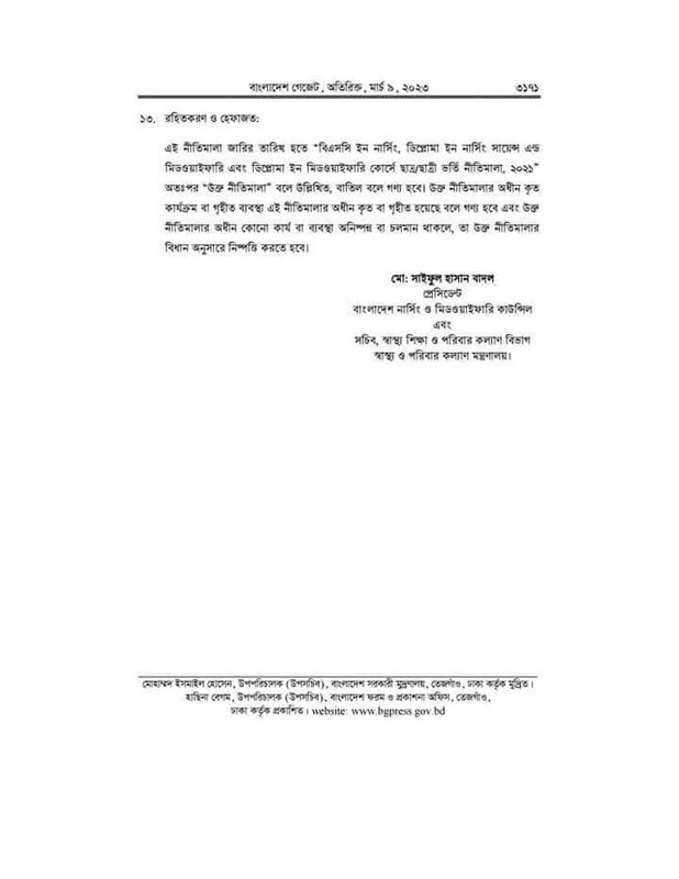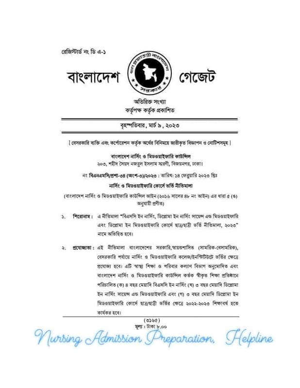 নার্সিং ও মিডওয়াইফারি কোর্সে ভর্তি নীতিমালা প্রকাশ। বিএসসি ইন নার্সিং(৪ বছর), ডিপ্লোমা ইন নার্সিং সায়েন্স এন্ড মিডওয়াইফারি (৩ বছর) এবং ডিপ্লোমা ইন মিডওয়াইফারি (৩ বছর) কোর্সে ছাত্র/ ছাত্রী ভর্তি নীতিমালা-২০২৩। কোর্স শেষে ইন্টার্নশীপ বাধ্যতামূলক (৬ মাস)। নার্সিং ও মিডওয়াইফারি কোর্সে ভর্তি নীতিমালা (বাংলাদেশ নার্সিং ও মিডওয়াইফারি কাউন্সিল আইন (২০১৬ সালের ৪৮ নং আইন) এর ধারা ৫ (৫) অনুযায়ী প্রণীত। এ নীতিমালা “বিএসসি ইন নার্সিং, ডিপ্লোমা ইন নার্সিং সায়েন্স এন্ড মিডওয়াইফারি এবং ডিপ্লোমা ইন মিডওয়াইফারি কোর্সে ছাত্র/ছাত্রী ভর্তি নীতিমালা, ২০২৩ নামে অভিহিত হবে।